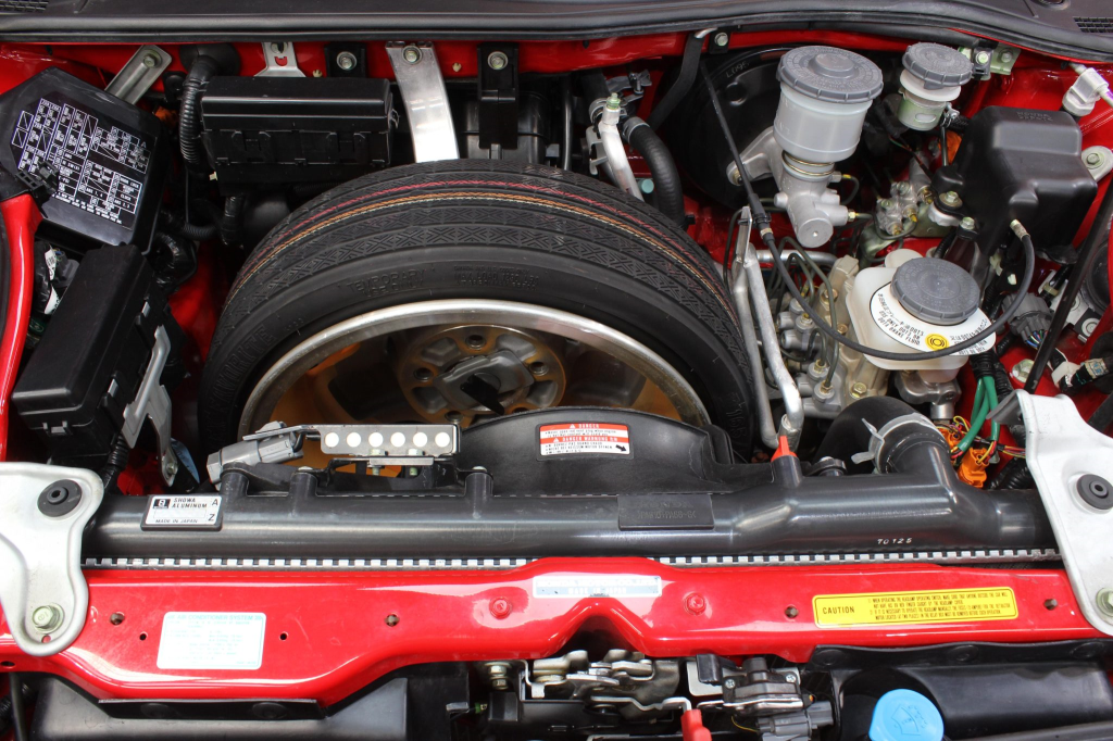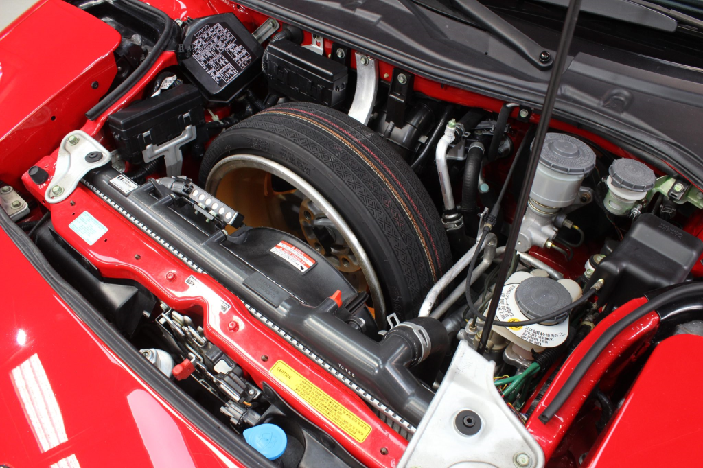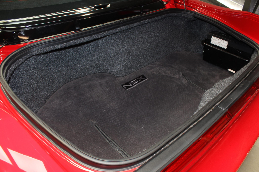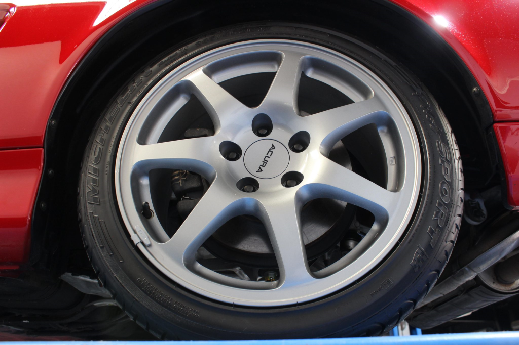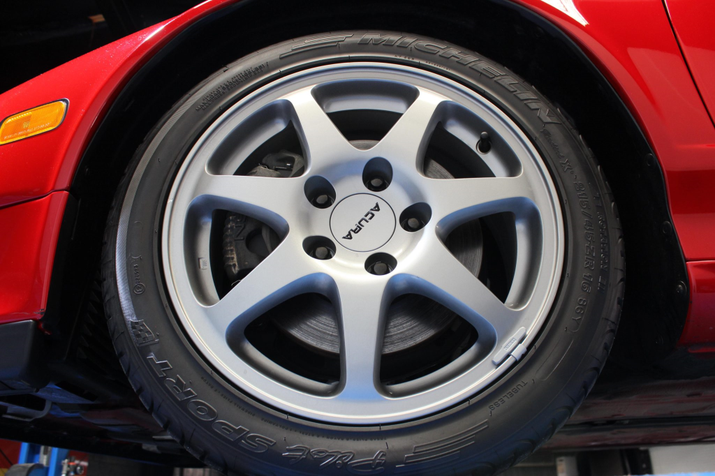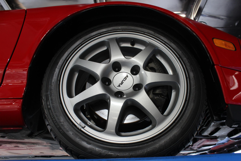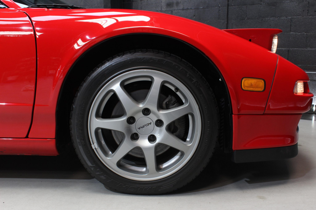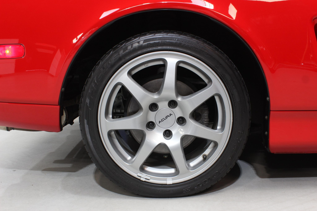 Staggered-diameter 16” and 17” seven-spoke aluminum wheels are mounted with Michelin tires. The car features a four-wheel double-wishbone suspension with front and rear stabilizer bars, and braking is handled by NSX-branded calipers over vented rotors at each corner.