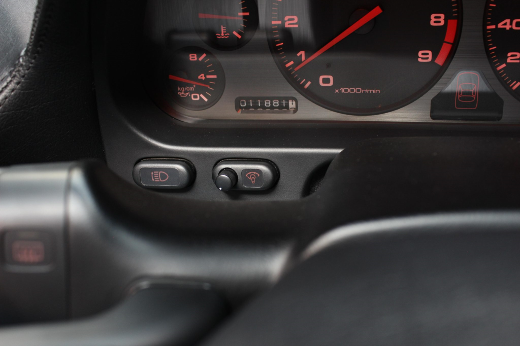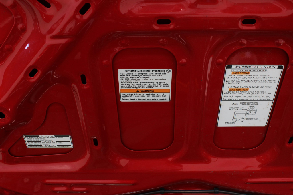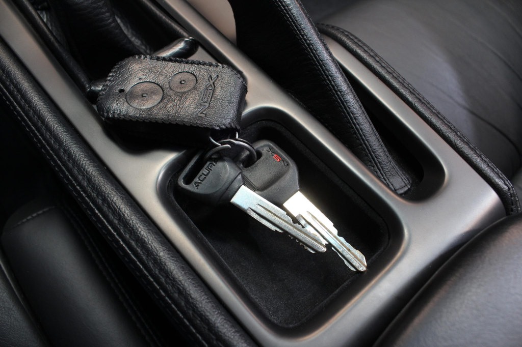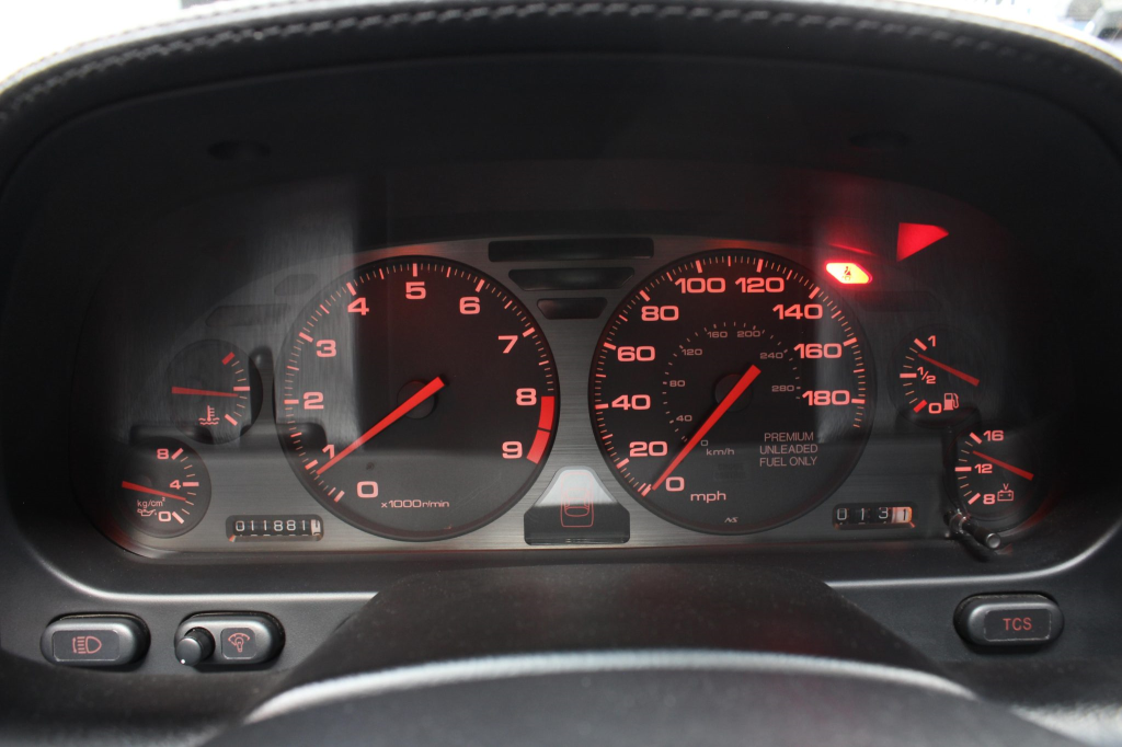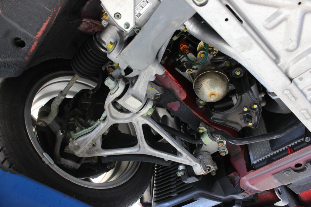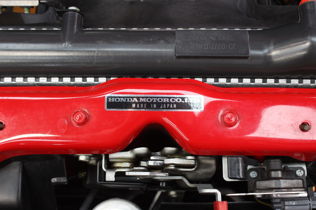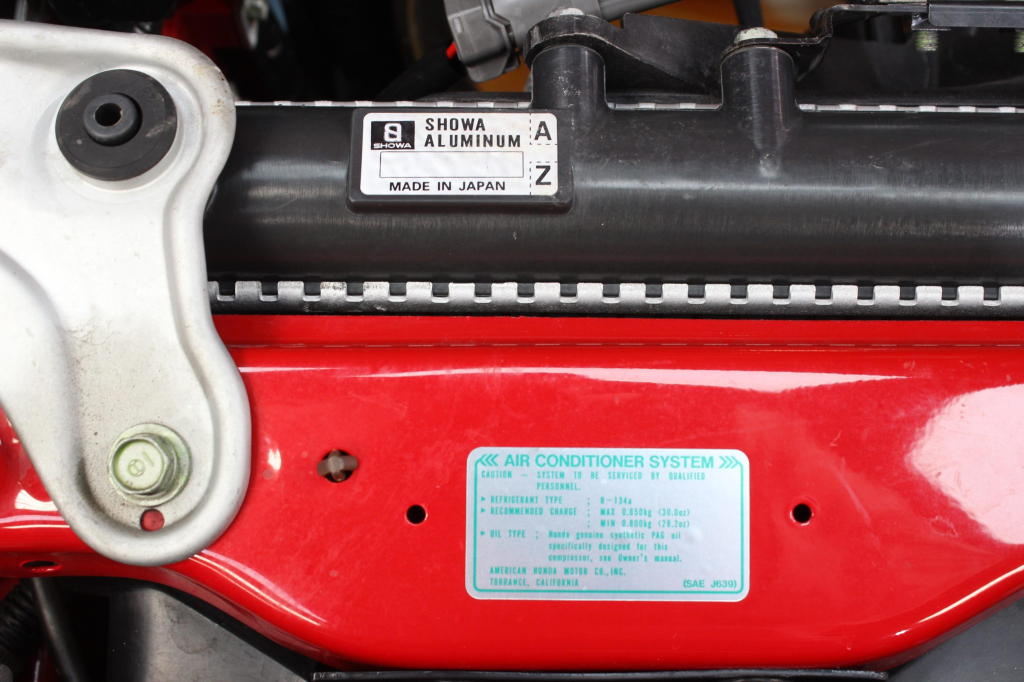 Staggered-diameter 16” and 17” seven-spoke aluminum wheels are mounted with Michelin tires. The car features a four-wheel double-wishbone suspension with front and rear stabilizer bars, and braking is handled by NSX-branded calipers over vented rotors at each corner.