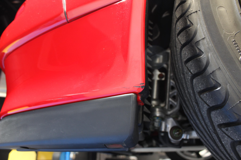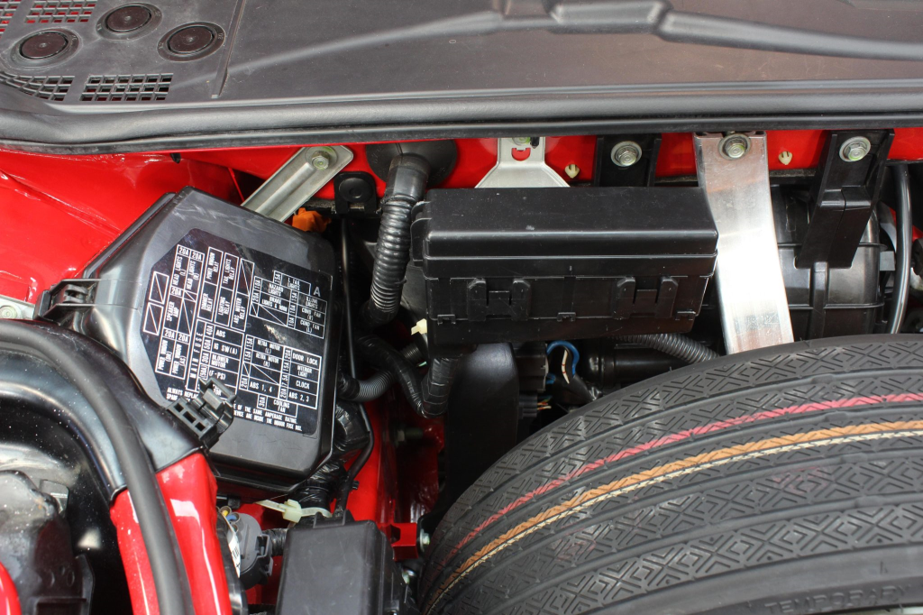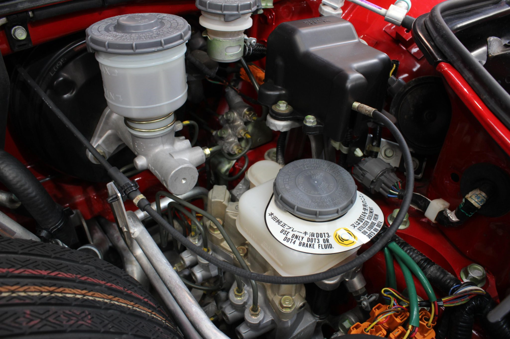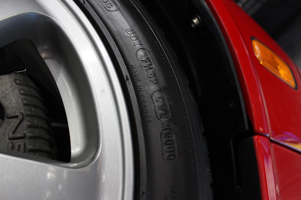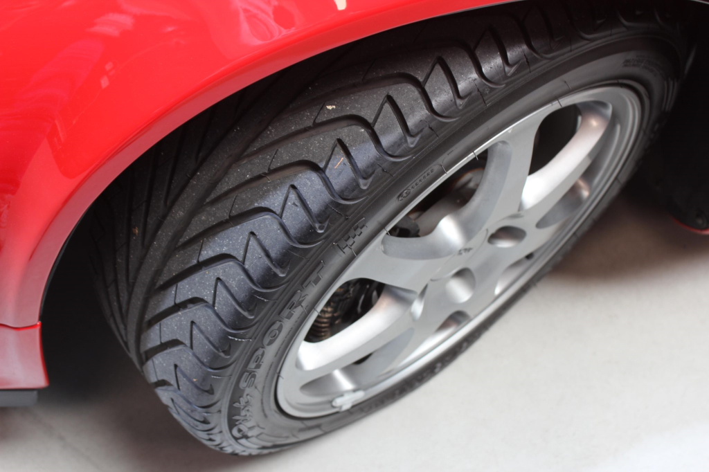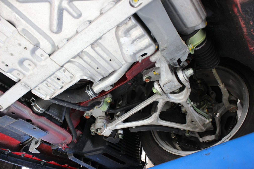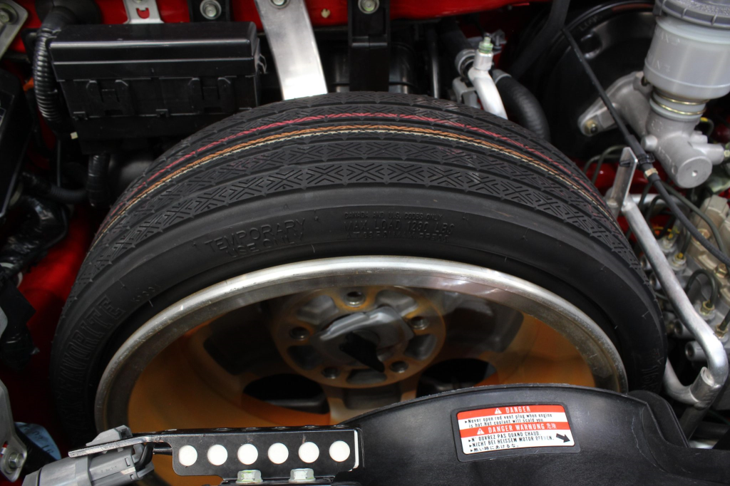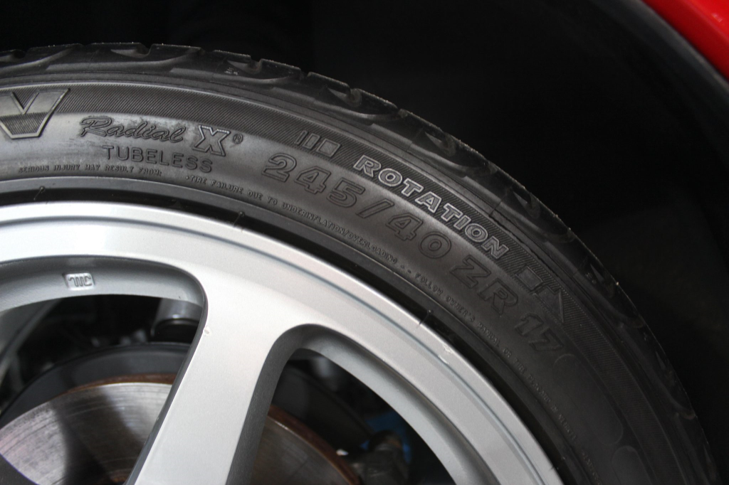 Staggered-diameter 16” and 17” seven-spoke aluminum wheels are mounted with Michelin tires. The car features a four-wheel double-wishbone suspension with front and rear stabilizer bars, and braking is handled by NSX-branded calipers over vented rotors at each corner.