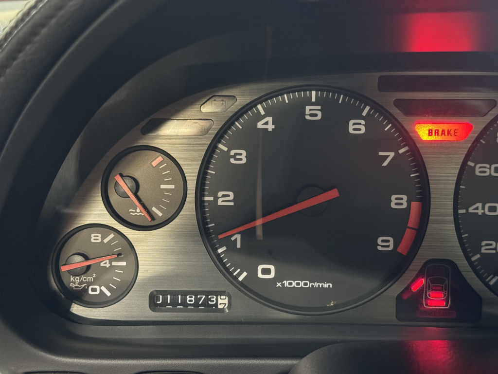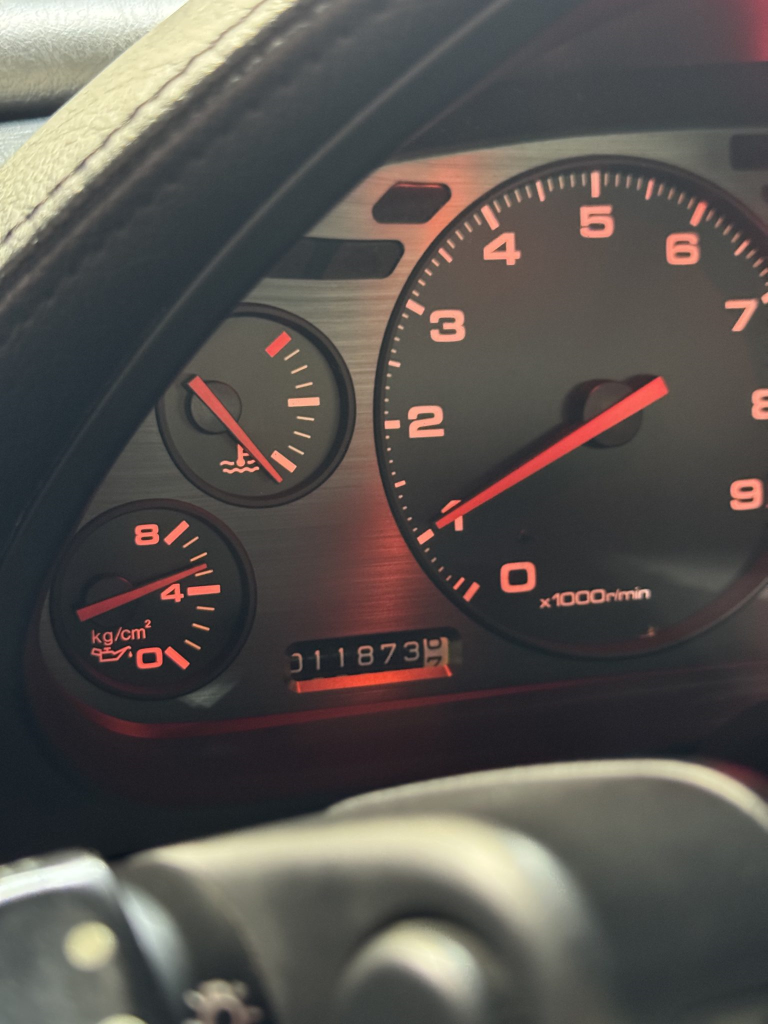 The leather-wrapped steering wheel frames a tachometer with an 8k-rpm redline, a 188-mph speedometer, and gauges for coolant temperature, oil pressure, voltage, and fuel level. The six-digit odometer shows 12k miles.