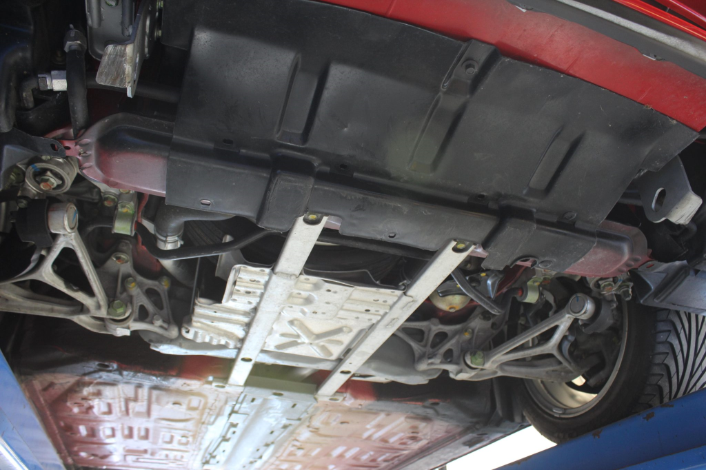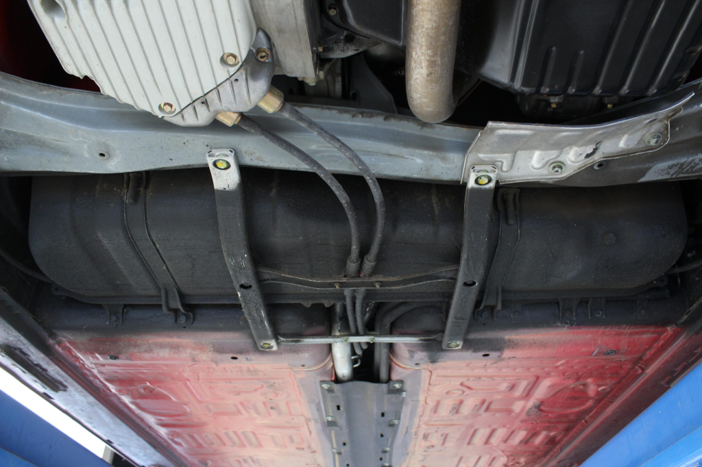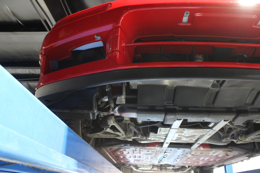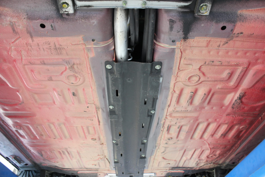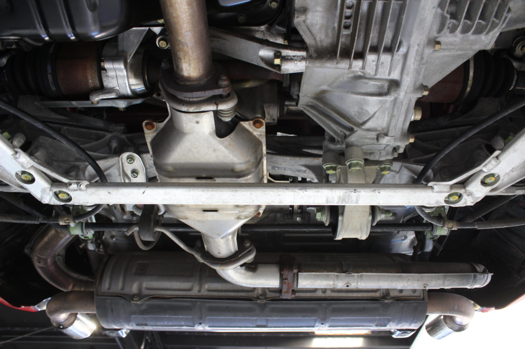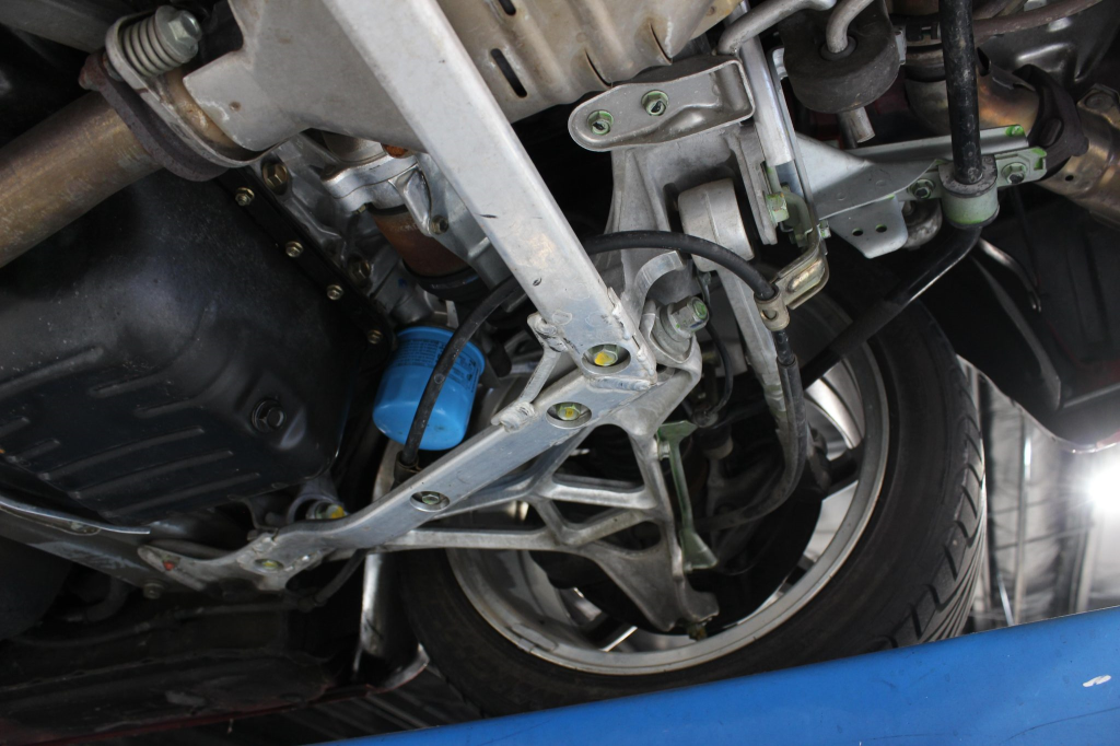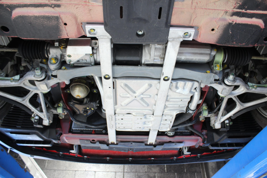 Power is routed to the rear wheels via a five-speed manual transaxle and a limited-slip differential. Additional photos of the underside are provided in the gallery.