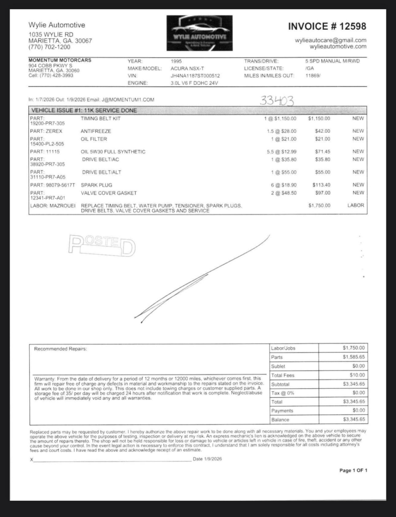 This 1995 Acura NSX-T remained under the care of its original owner in Tennessee until 2025, at which time it was acquired by the selling dealer and subsequently received a timing belt service that also included replacement of the water pump, spark plugs, valve cover gaskets, and drive belts. Showing 12k miles, it is powered by a 3.0-liter VTEC V6 paired with a five-speed manual transaxle and is finished in Formula Red over black leather. The car is equipped with staggered-diameter 16” and 17” aluminum wheels, a limited-slip differential, a removable body-color roof panel, pop-up headlights, power-adjustable seats, automatic climate control, cruise control, a CD changer, and a Bose sound system. This NSX-T is now offered in Georgia by the selling dealer with a window sticker, a car cover, the owner’s manual, a front-end cover, a clean Carfax report, and a Tennessee title.