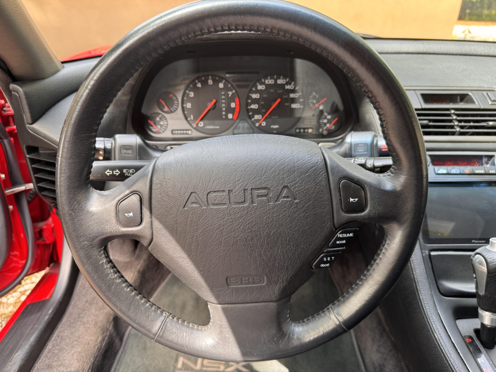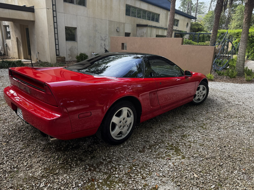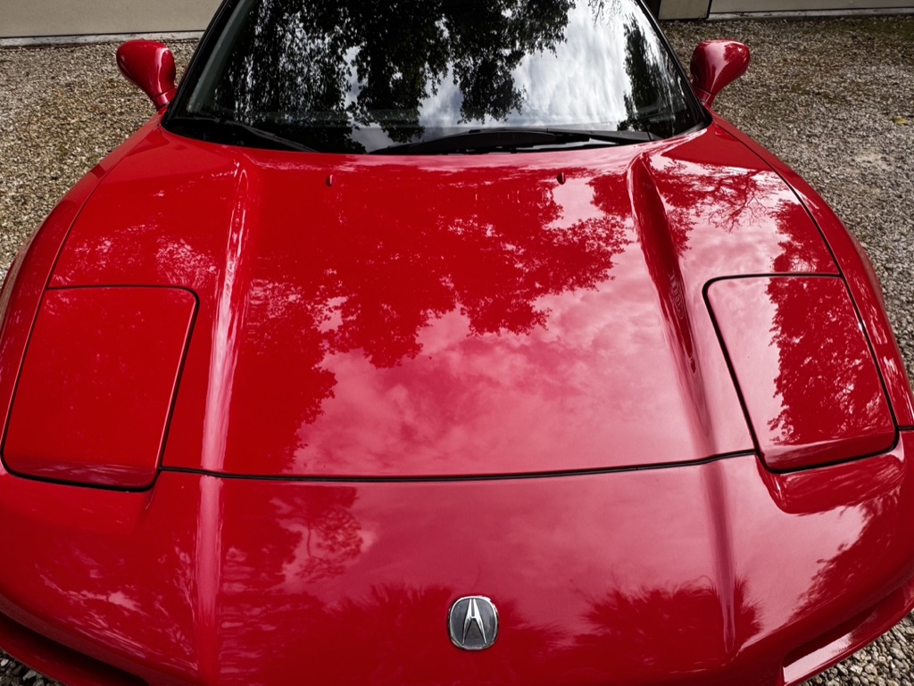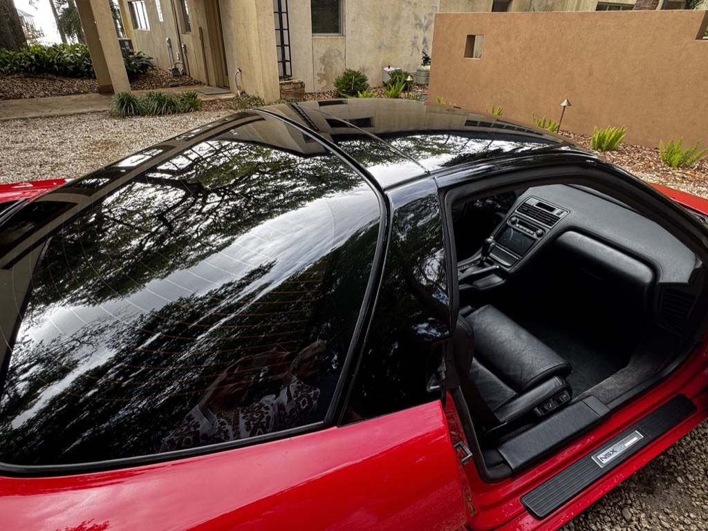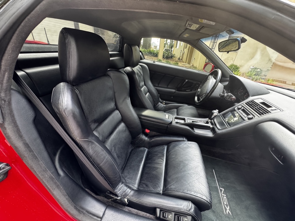 The NSX featured aluminum bodywork, and this example is finished in Formula Red with a black roof panel and pillars. A rearview camera has been installed, and additional exterior details include pop-up headlights, an integrated rear wing, side air intakes, power-adjustable side mirrors, and dual exhaust outlets. The seller states the lower door seals were replaced and an S2000-sourced antenna was installed. Close-up photos of blemishes along the body can be seen in the gallery.