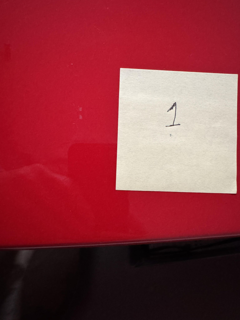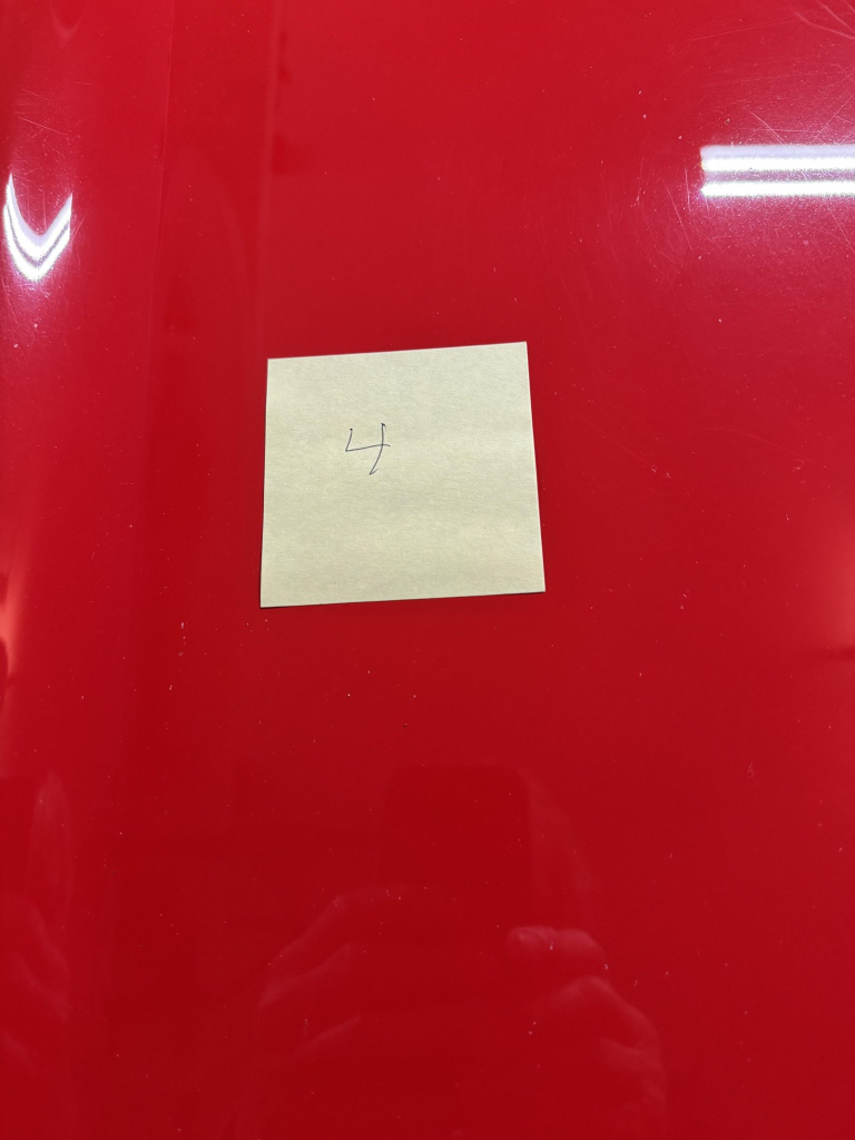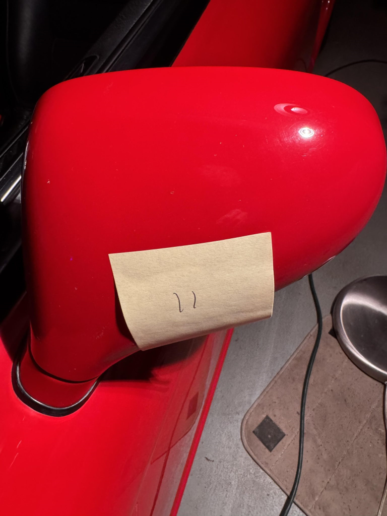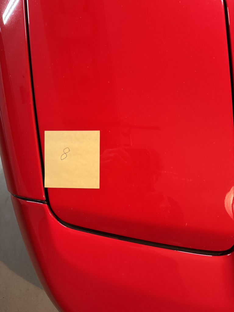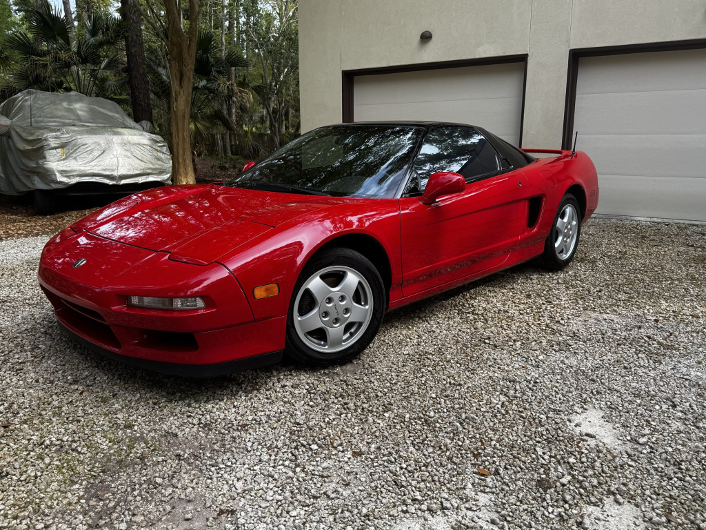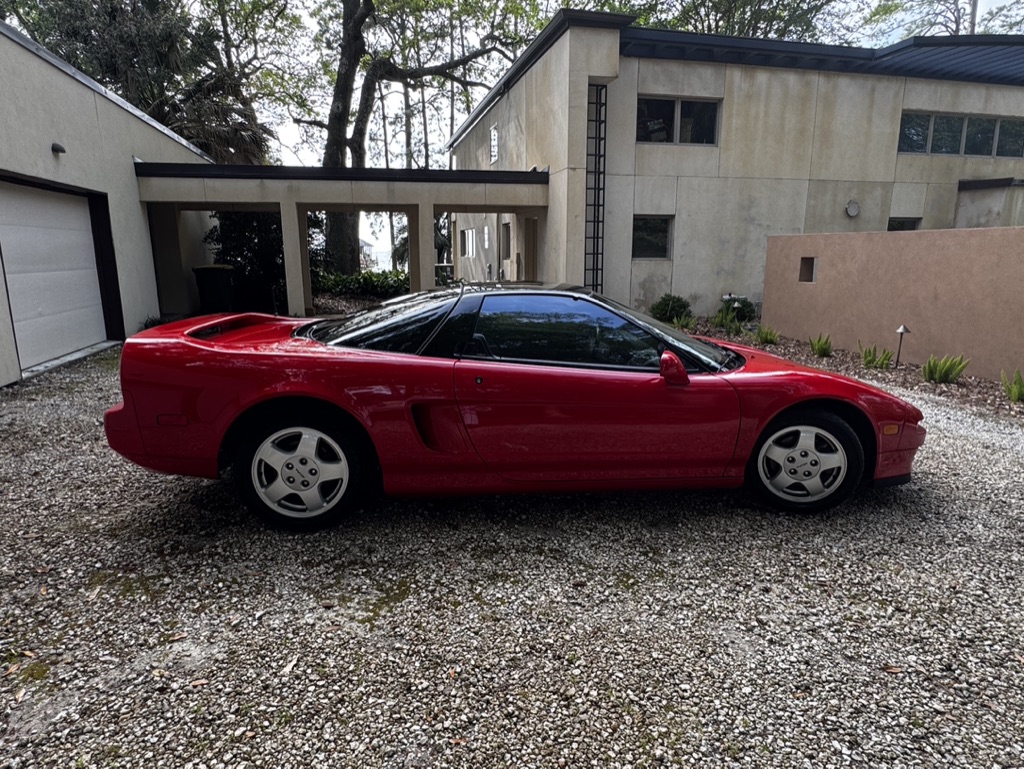 The NSX featured aluminum bodywork, and this example is finished in Formula Red with a black roof panel and pillars. A rearview camera has been installed, and additional exterior details include pop-up headlights, an integrated rear wing, side air intakes, power-adjustable side mirrors, and dual exhaust outlets. The seller states the lower door seals were replaced and an S2000-sourced antenna was installed. Close-up photos of blemishes along the body can be seen in the gallery.