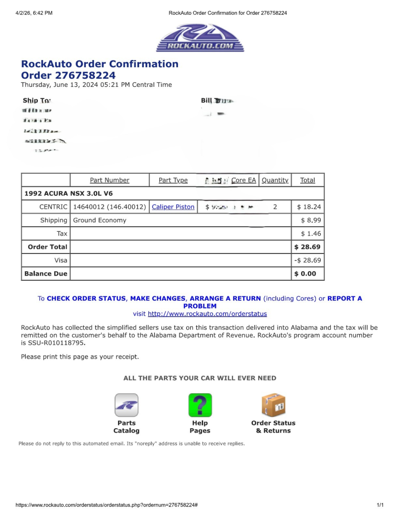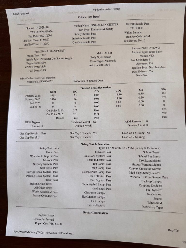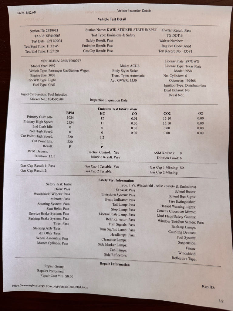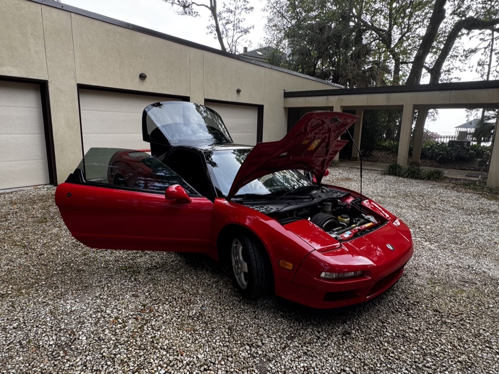 This 1992 Acura NSX spent two decades in Texas, and it was acquired by the seller on BaT in April 2024. Subsequent work included mounting 15″ and 16″ forged wheels with Yokohama tires, installing keyless entry, a Pioneer head unit, and Kicker speakers, and replacing the shocks, trunk, and rear hatch struts. The car is finished in Formula Red over black leather upholstery and is powered by a 3.0-liter VTEC V6 paired with a four-speed automatic transaxle. The vehicle has a limited-slip differential, a black roof panel, pop-up headlights, power-adjustable seats, automatic climate control, and cruise control. This NSX is now offered with a spare set of wheels, spare parts, invoices, and a clean Alabama title in the seller’s name.