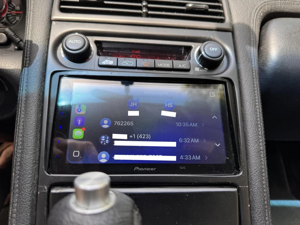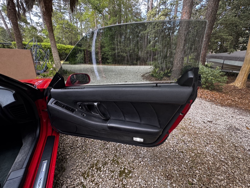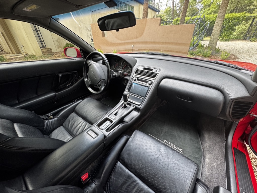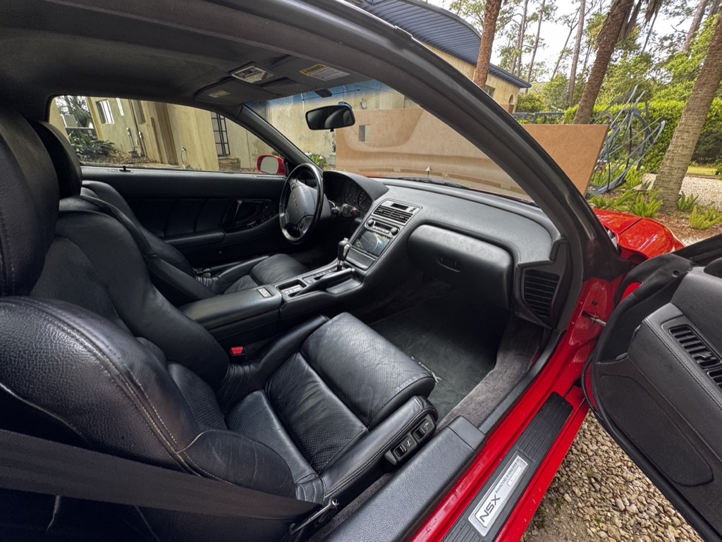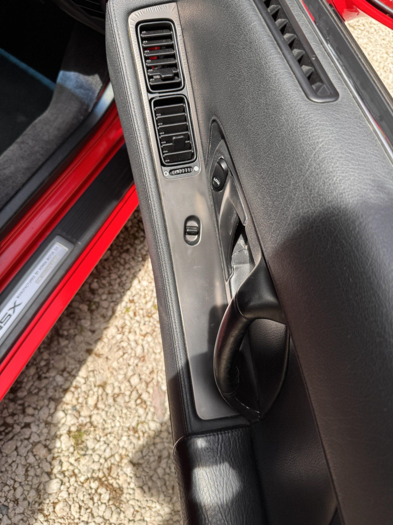 The cabin features power-adjustable sport seats upholstered in black leather, and the stainless-steel door sill plates are stamped with the car’s serial number. Interior amenities include automatic climate control, cruise control, and NSX-branded floor mats. Noted work under current ownership involved servicing the air mix motor and installing LED interior lights, keyless entry, Kicker speakers, and a Pioneer head unit with Apple CarPlay and Android Auto. The trunk and rear hatch struts were replaced in 2024. A replacement left window regulator and upgraded pulley kit have been installed, and the factory right window regulator unit was upgraded with the same pulley kit.