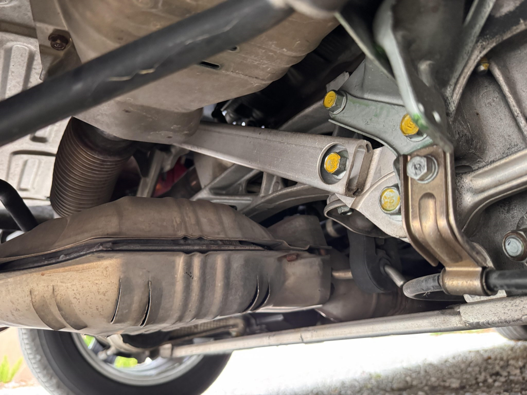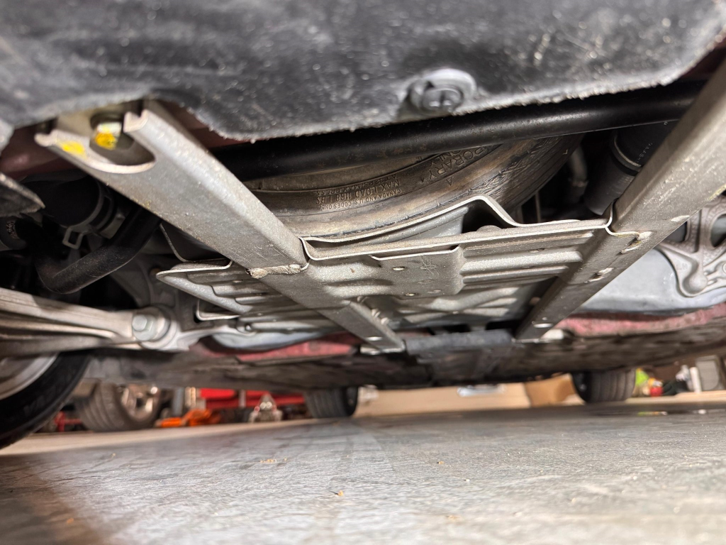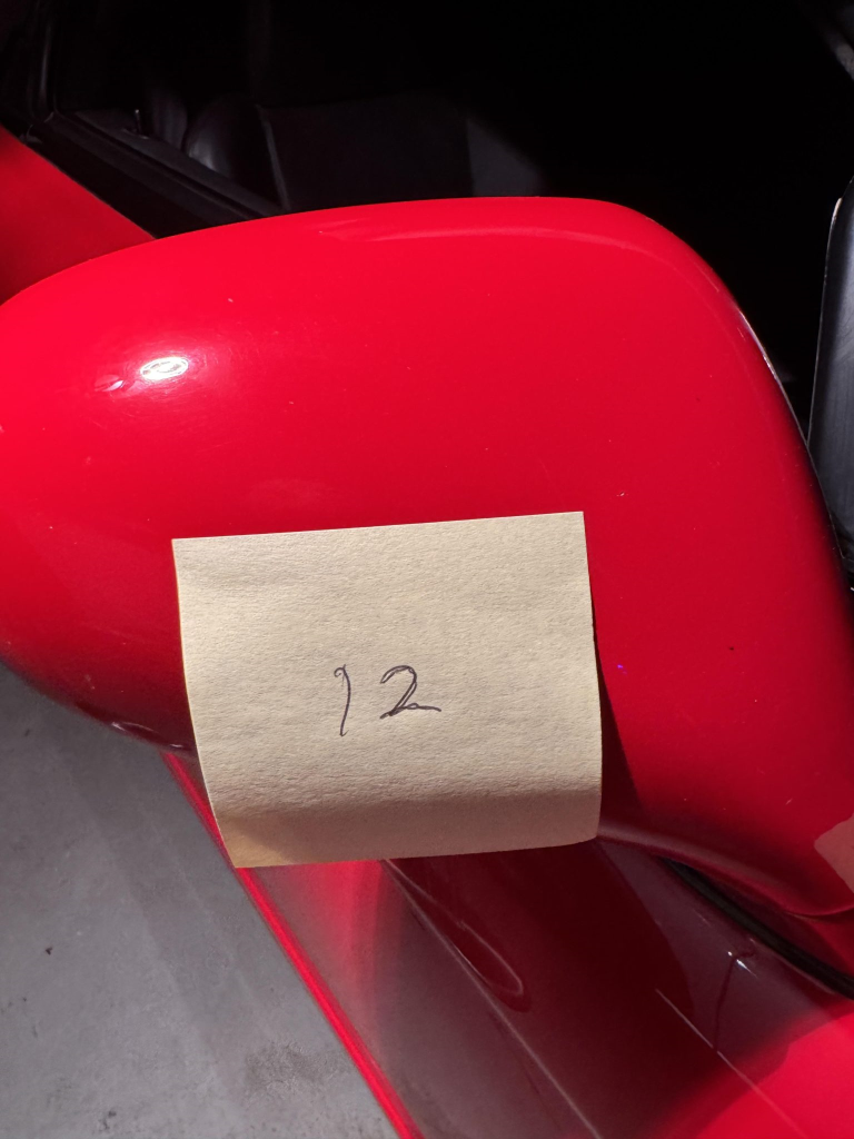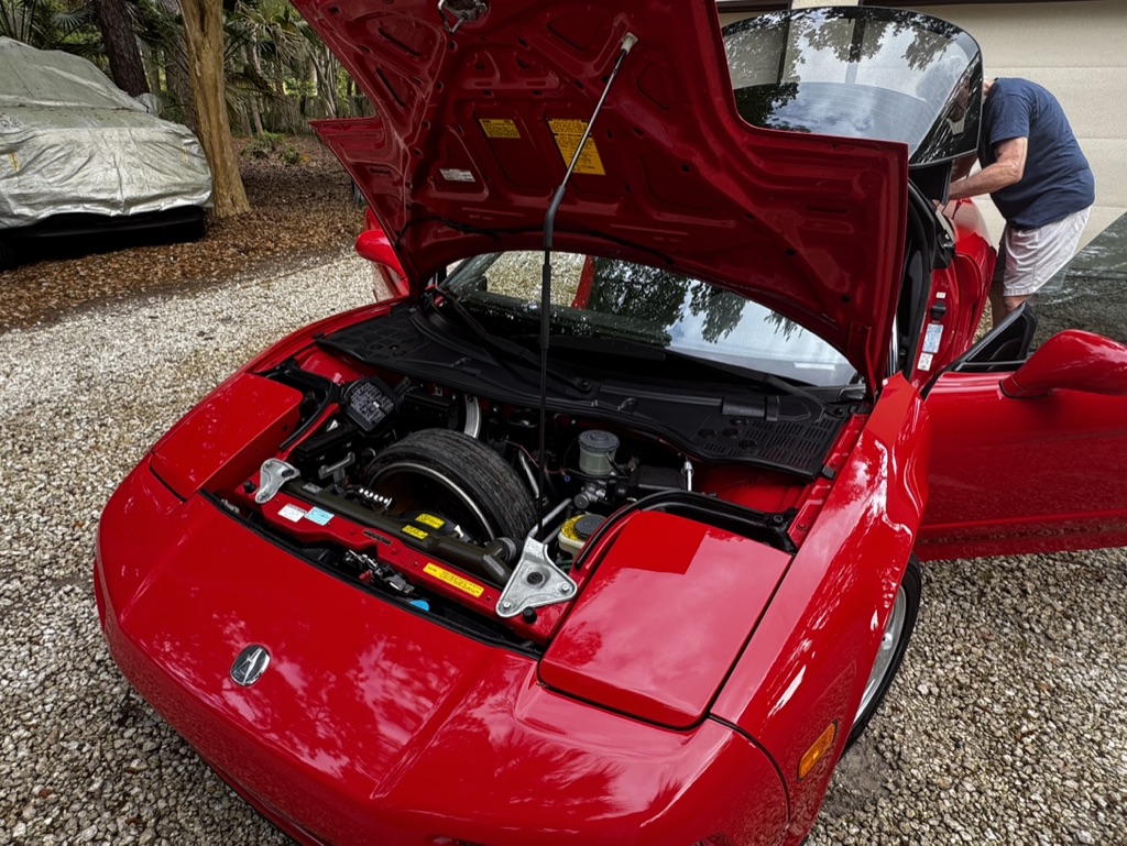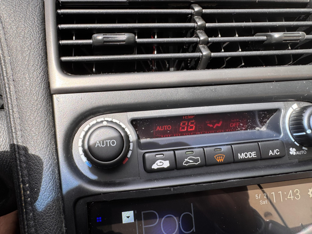 The cabin features power-adjustable sport seats upholstered in black leather, and the stainless-steel door sill plates are stamped with the car’s serial number. Interior amenities include automatic climate control, cruise control, and NSX-branded floor mats. Noted work under current ownership involved servicing the air mix motor and installing LED interior lights, keyless entry, Kicker speakers, and a Pioneer head unit with Apple CarPlay and Android Auto. The trunk and rear hatch struts were replaced in 2024. A replacement left window regulator and upgraded pulley kit have been installed, and the factory right window regulator unit was upgraded with the same pulley kit.