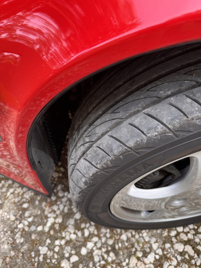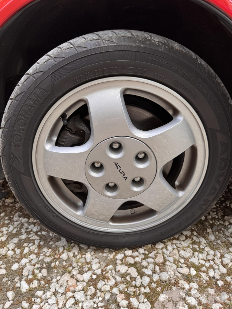 The 15″ and 16″ five-spoke forged wheels were mounted with 205/50 front and 225/50 rear mixed Yokohama tires under current ownership. The car features a four-wheel double-wishbone suspension with front and rear stabilizer bars, and braking is handled by NSX-branded calipers over vented rotors at each corner. The shocks were replaced in 2024 with used units that had 20k miles of use according to the seller.