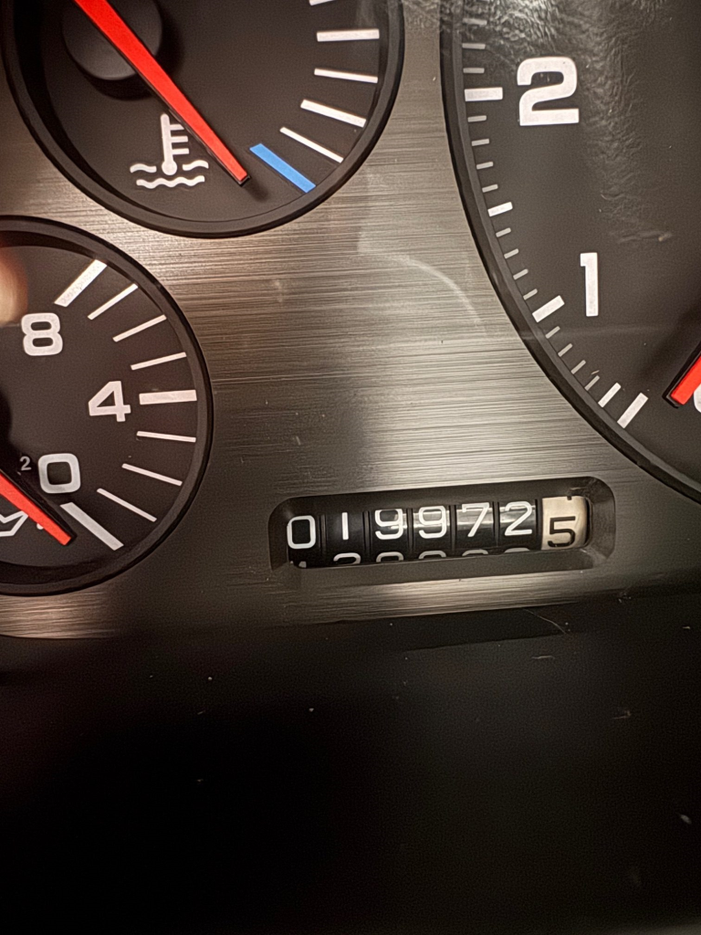 The leather-wrapped steering wheel frames a tachometer with a 7,500-rpm redline as well as a 188-mph speedometer and gauges for coolant temperature, oil pressure, voltage, and fuel level. The six-digit odometer shows 20k miles, approximately 500 of which were added under current ownership. A mileage inconsistency is listed in a January 2024 entry on the Carfax report. The seller believes that the instrument cluster was replaced in 2006 based on Texas inspection records shown in the gallery, which list the mileage as 109,508 in December 2004 and 116 in January 2006. Total mileage is unknown.